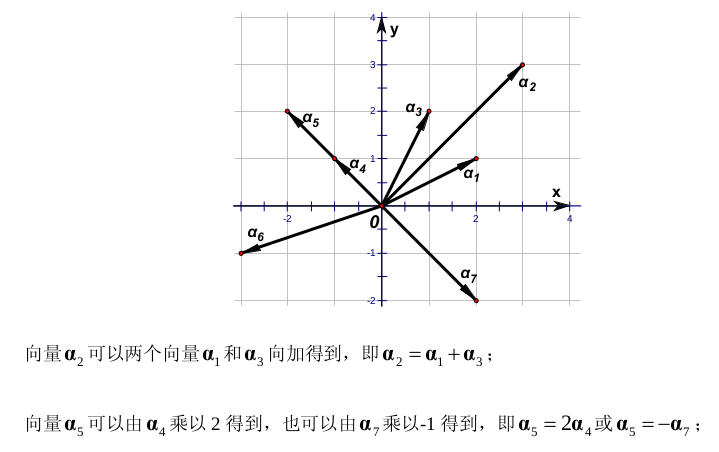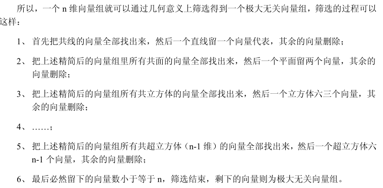 从几何意义上讲,在一个向量组里,如果有多个向量在一条直线上,哪么这些向量只要一个向量就可以了, 其他的同直线的向量可以被代表了。这个向量代表可以是任意一个非零向量;进而,如果向量组里还有多 个向量构成且存在于一个平面上,那么只要有两个非零非共线的向量就可以代表其他的共面向量了;继续, 如果向量组里还有多个向量构成且存在于一个立体空间里,那么只要有三个非零非共线非共面的向量就可 以代表其它的同立体向量了...。