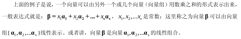 上面两句话意思就是说,一个向量组应该可以张成一个和向量组元素个数相同的子空间,一个 向量张成一维的子空间,两个向量应张成二维的字空间...;如果一个向量组n个元素,张成一个 小于n的子空间,那么这个向量组就线性相关;如果总是张成一个n维的子空间,那么这个向量组 就线性无关。